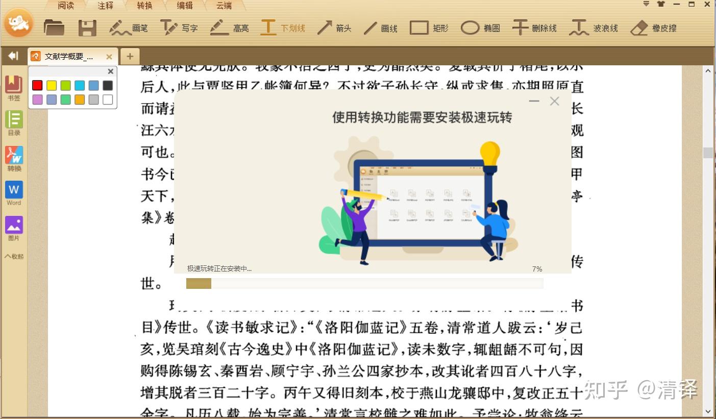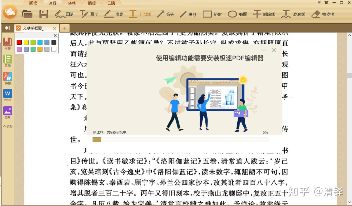 缺点:虽然号称是最小的PDF阅读器,但是我一点转换和编辑,就自己下载新的东西!什么狗屎!而且也没问我同意不同意啊?自己就开始下载?为了测试我下了,结果下完还要安装?!个人不太喜欢在电脑上乱下东西,所以没下,不知道好不好用,不过我也就是需要PDF阅读,不太需要编辑功能。