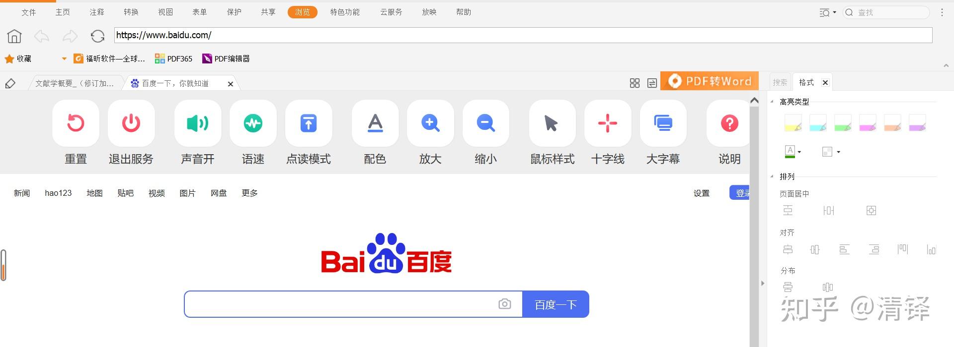 缺点:①和WPS有点像,功能很齐全,WPS没有功能他也有,很细节,比如高亮还能调透明度;而且两者兼容,WPS上的操作在福昕上也能显示。②可以开浏览器,就不能另外打开软件了,搜索方便!e