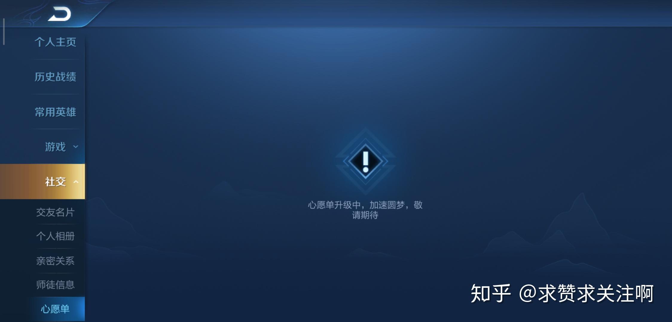 左边有5个大项,分别是个人主页、历史战绩、常用英雄、游戏、社交,游戏分为对战资料、信誉积分、荣誉资料、日之塔4个小项,社交分为交友名片、个人相册、亲密关系、师徒信息、心愿单5个小项。