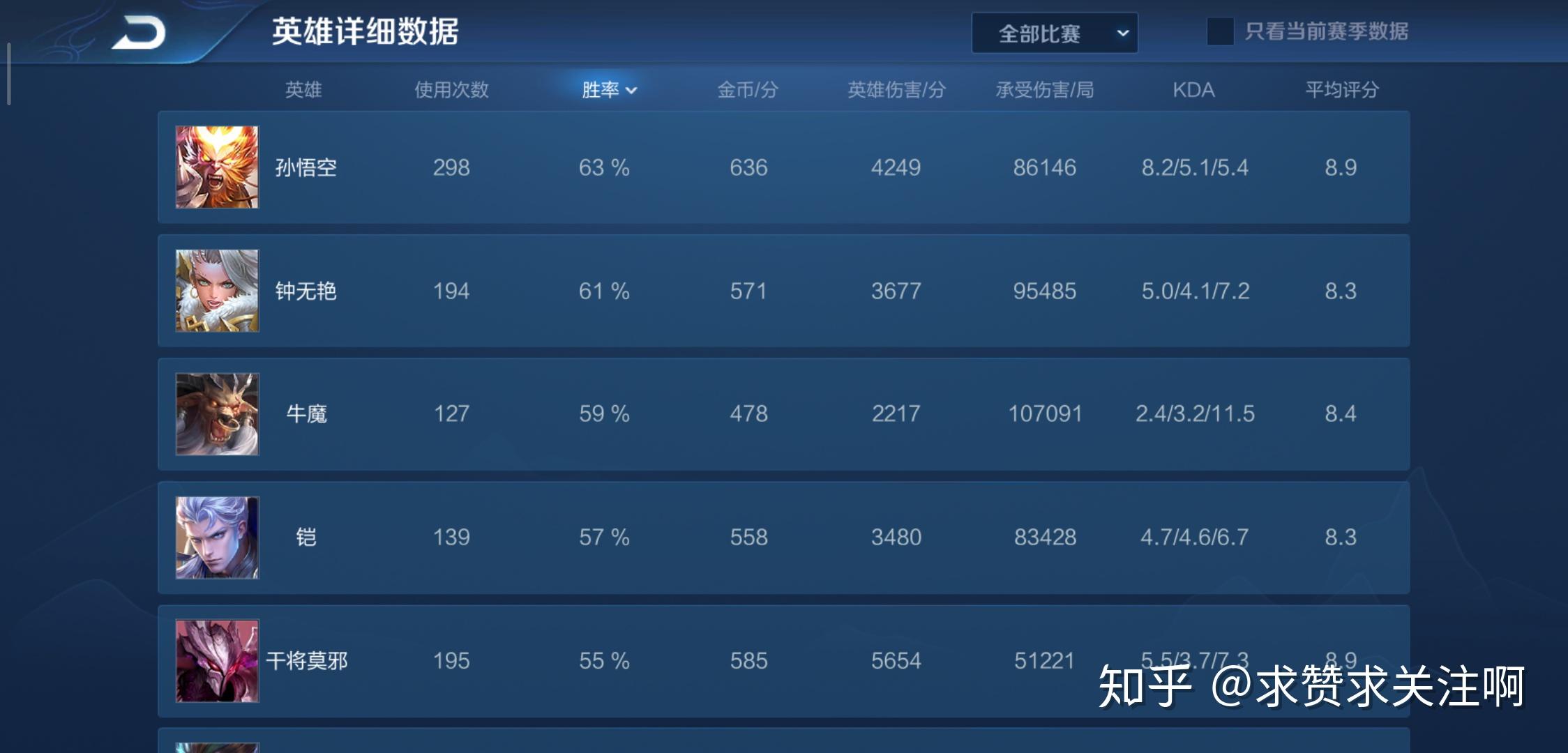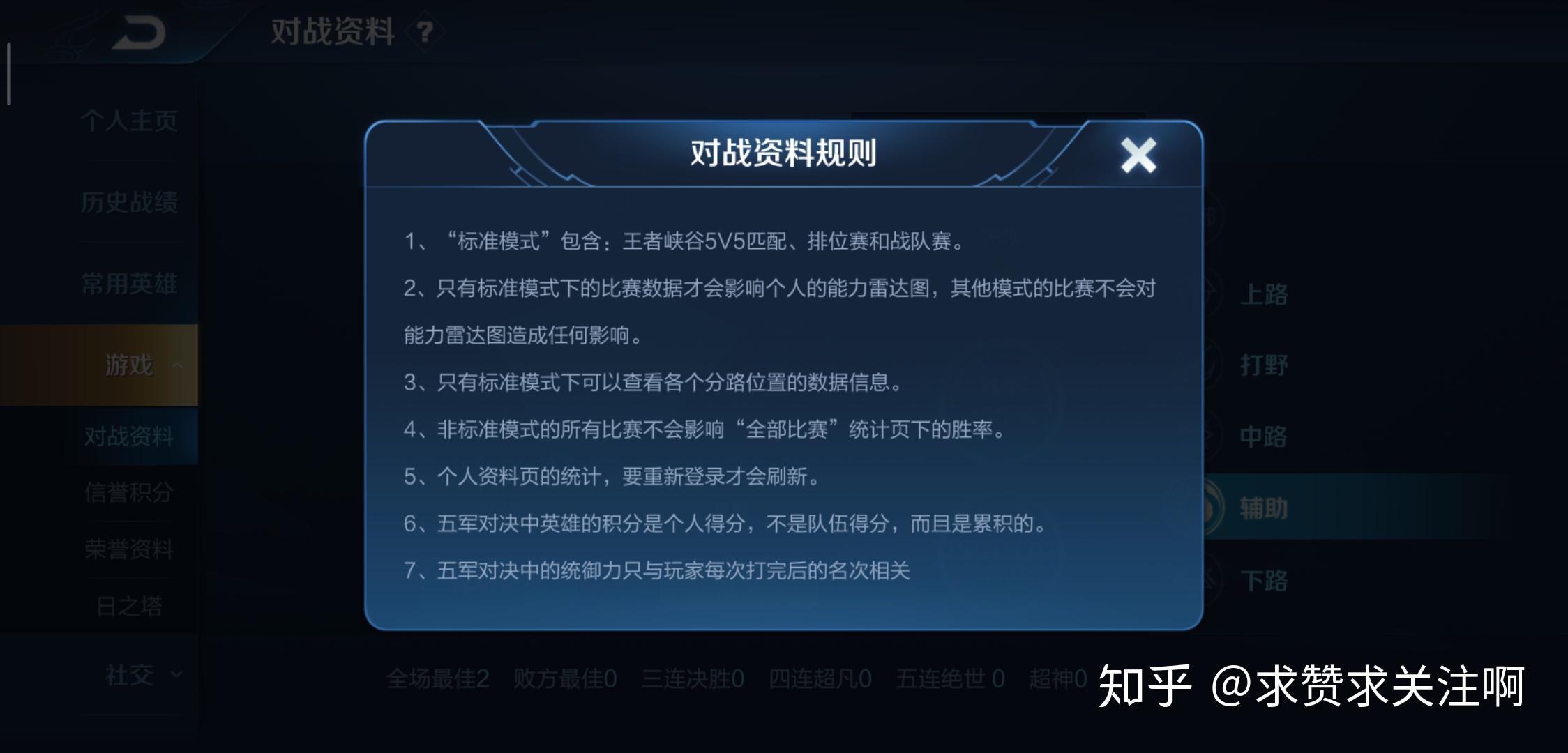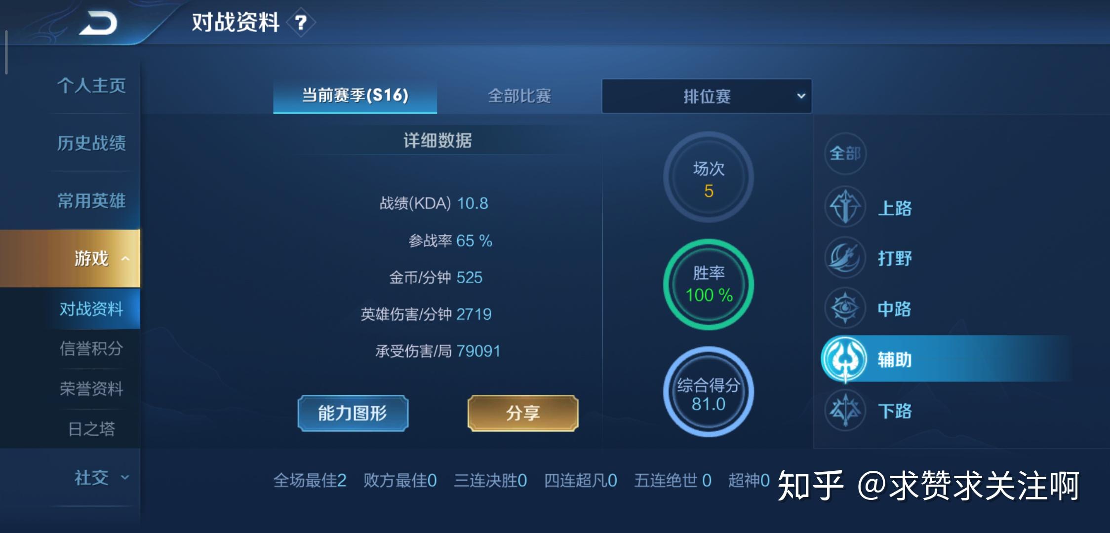 游戏里的对战资料可以查看全部比赛或当前赛季各种模式,各个位置的场次、胜率、综合得分,详细数据,下面有全场最佳、败方最佳、三连绝胜、四连超凡、五连绝世、超神次数。