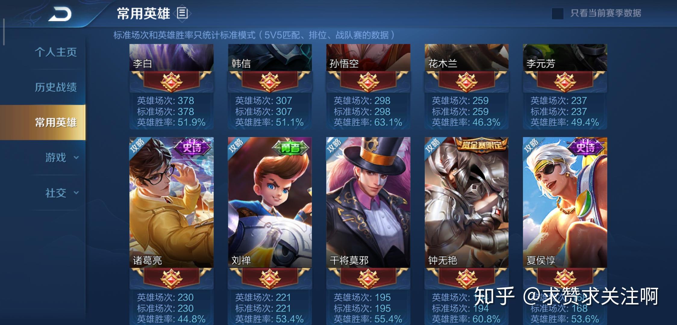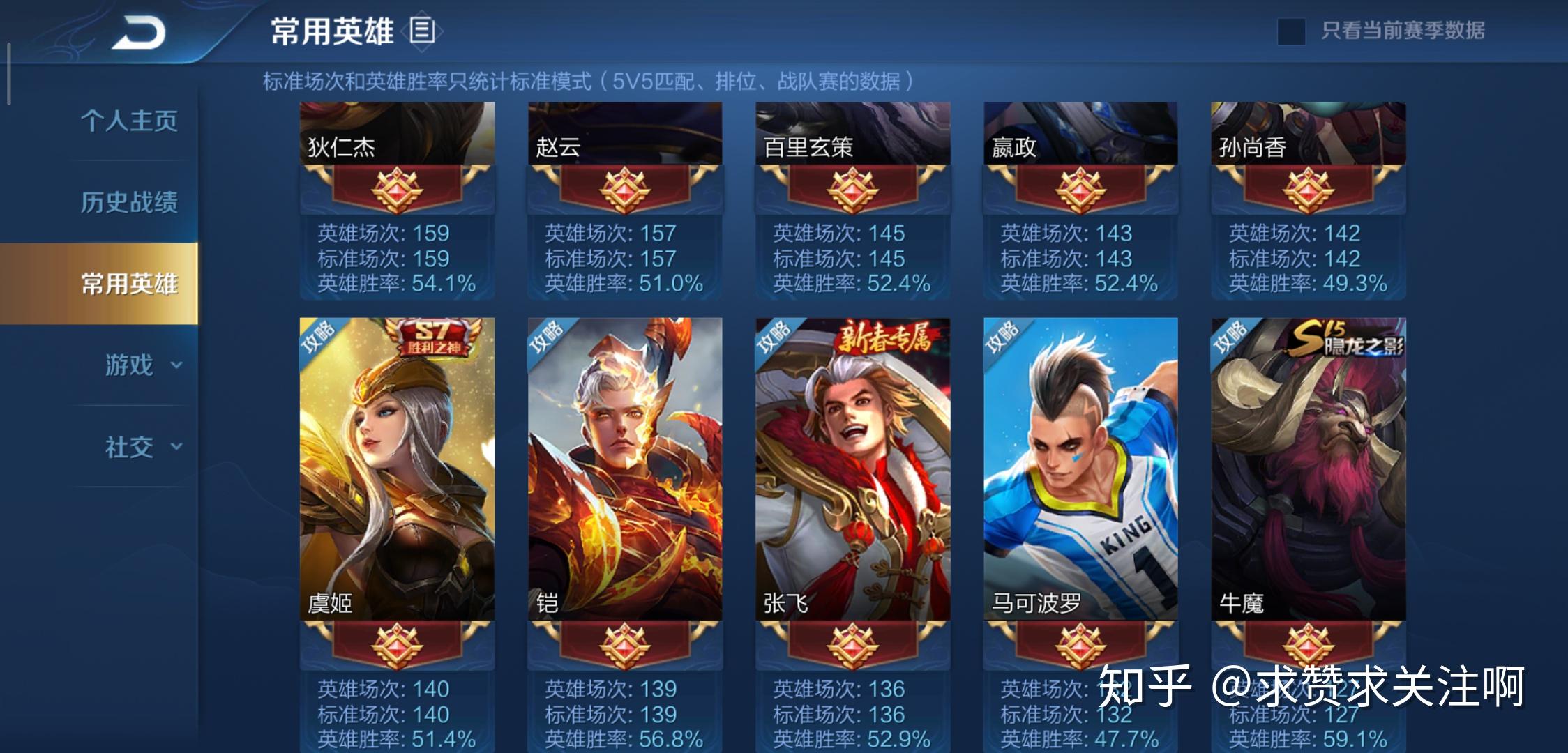 常用英雄界面最多可以显示20个英雄的资料包括皮肤、英雄场次、标准场次、英雄胜率,左上角的小方框打开后能看到英雄详细数据,最多显示20个英雄的详细数据,这两个页面的右上角都可以切换只看当前赛季数据。
