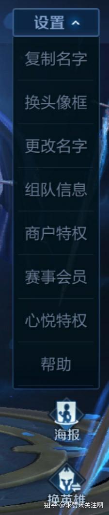 最右边的设置打开后出现一数列选项,复制名字、换头像框、更改名字、组队信息、商户特权、赛事会员、心悦特权、帮助。