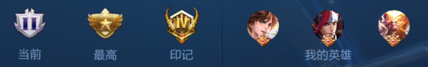 再往下的一行是当前段位,最高段位,王者印记,后面三个是我的英雄