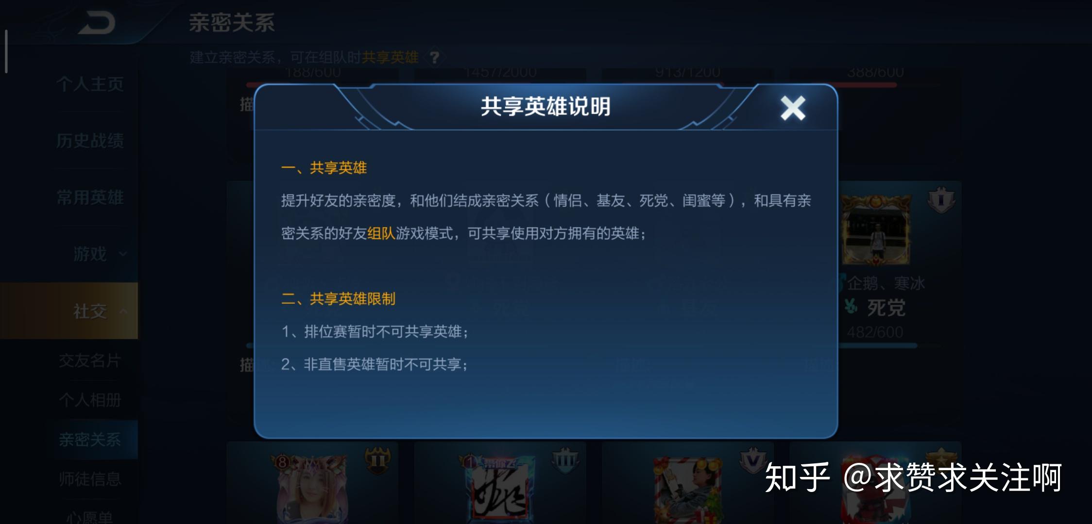 亲密关系最多可以建立16个,1个恋人,5个基友,5个死党,5个闺蜜,组队游戏可以共享英雄。