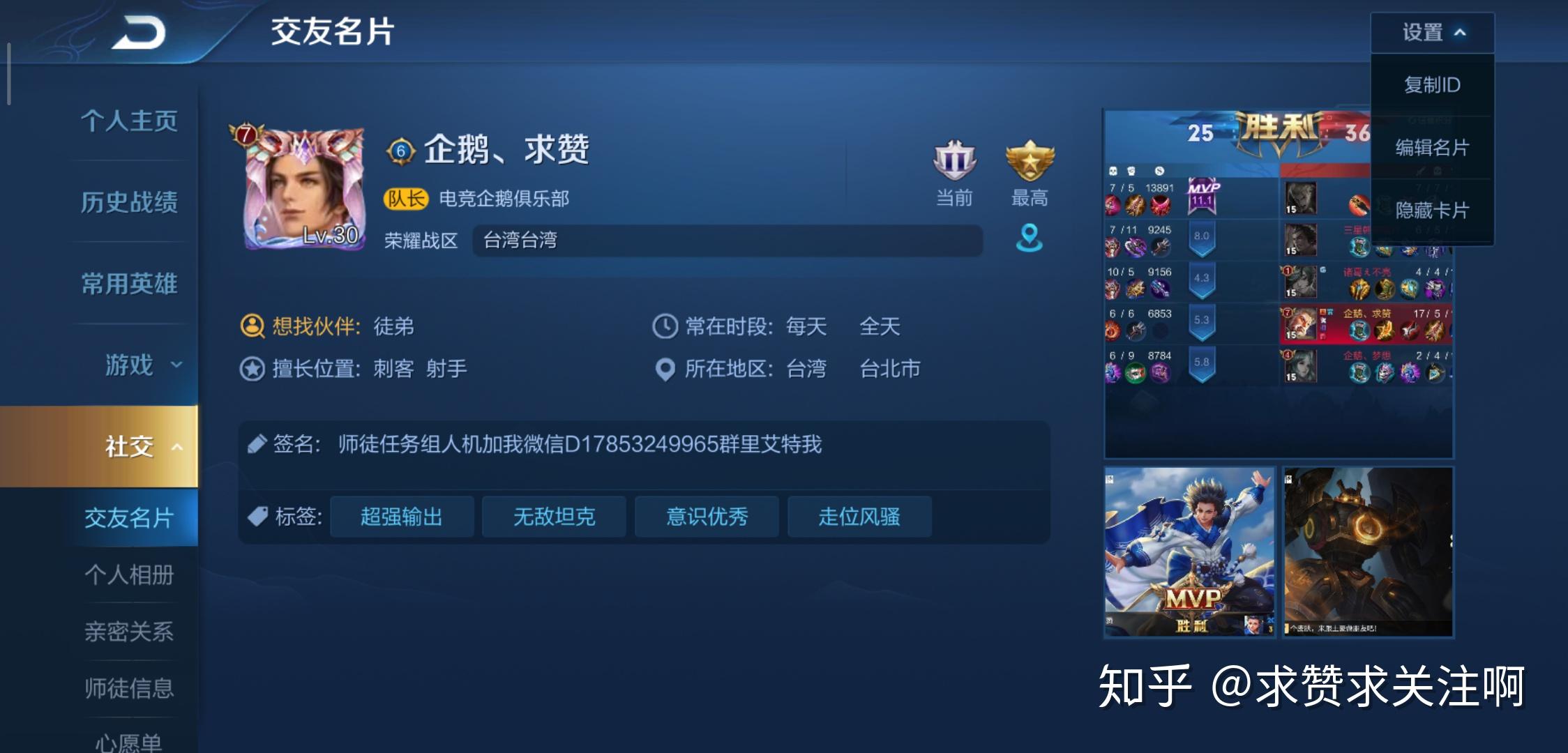 社交里的交友名片可以填写自己的各种社交信息,右上角设置里可以复制ID、编辑名片和隐藏卡片。