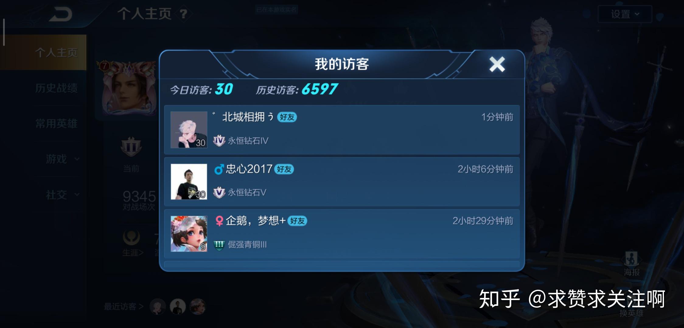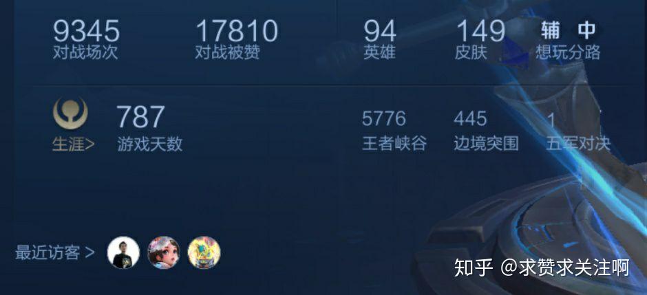 生涯后面是游戏天数,后面是王者峡谷、边境突围、五军对决的场次,最下面是最近访客,打开后能看到我的访客。