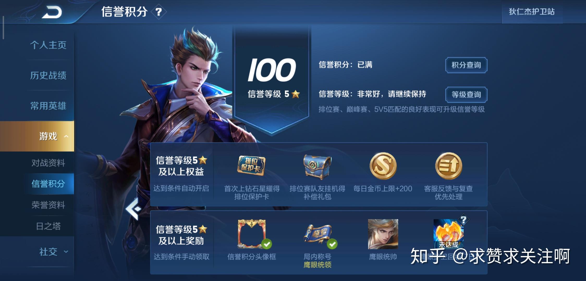 信誉积分页面可以查看信誉积分和信誉等级,最高分别是100分和5级,信誉情况好的玩家可以享受很多福利。