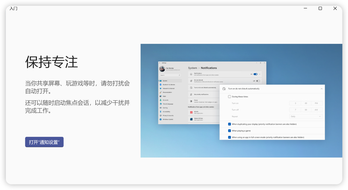 “入门 APP”,如果你的系统是全新安装的话,首次运行系统的时候会自动弹出,帮助你进行一些系统的基本设置,以及告知你一些使用新系统的基本指南。例如,如何使用新推出的专注功能;或是如何排布小组件,更高效的展示信息和实现定制化;还有应用商店里有什么适合的 APP 可以安装;开始菜单有什么变动,和其他新功能的使用技巧等。
