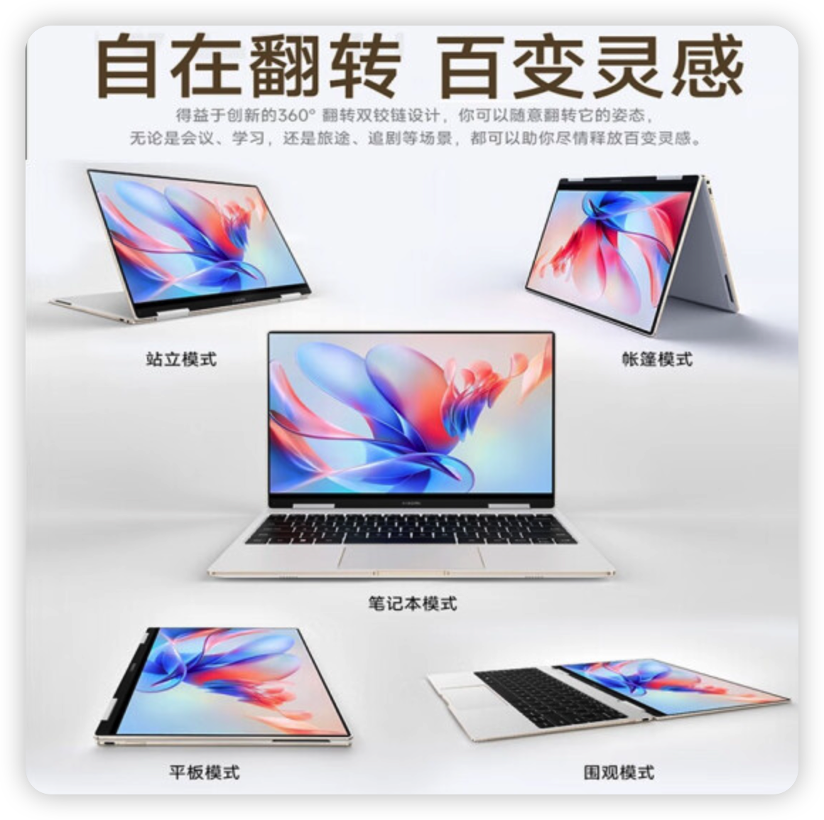 这种翻转二合一产品,在平时就是笔记本模式,而需要的时候可以翻转成平板模式,而在只需要观影放松的时候,又可以站立模式或帐篷模式,自在翻转,百变随心。