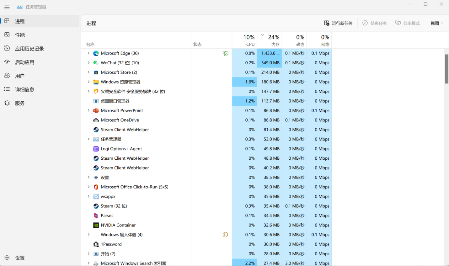 新界面下,一个是信息的显示体验更好了,分为左右两栏,左侧是选项卡,右侧是展示页。这样去显示,整体显示效率变高了不少。而且重绘过的任务管理器界面,也算是摆脱了旧时代的设计,拥抱 Windows 11 的新设计理念,整体和系统 UI 也更和谐统一,更轻快。