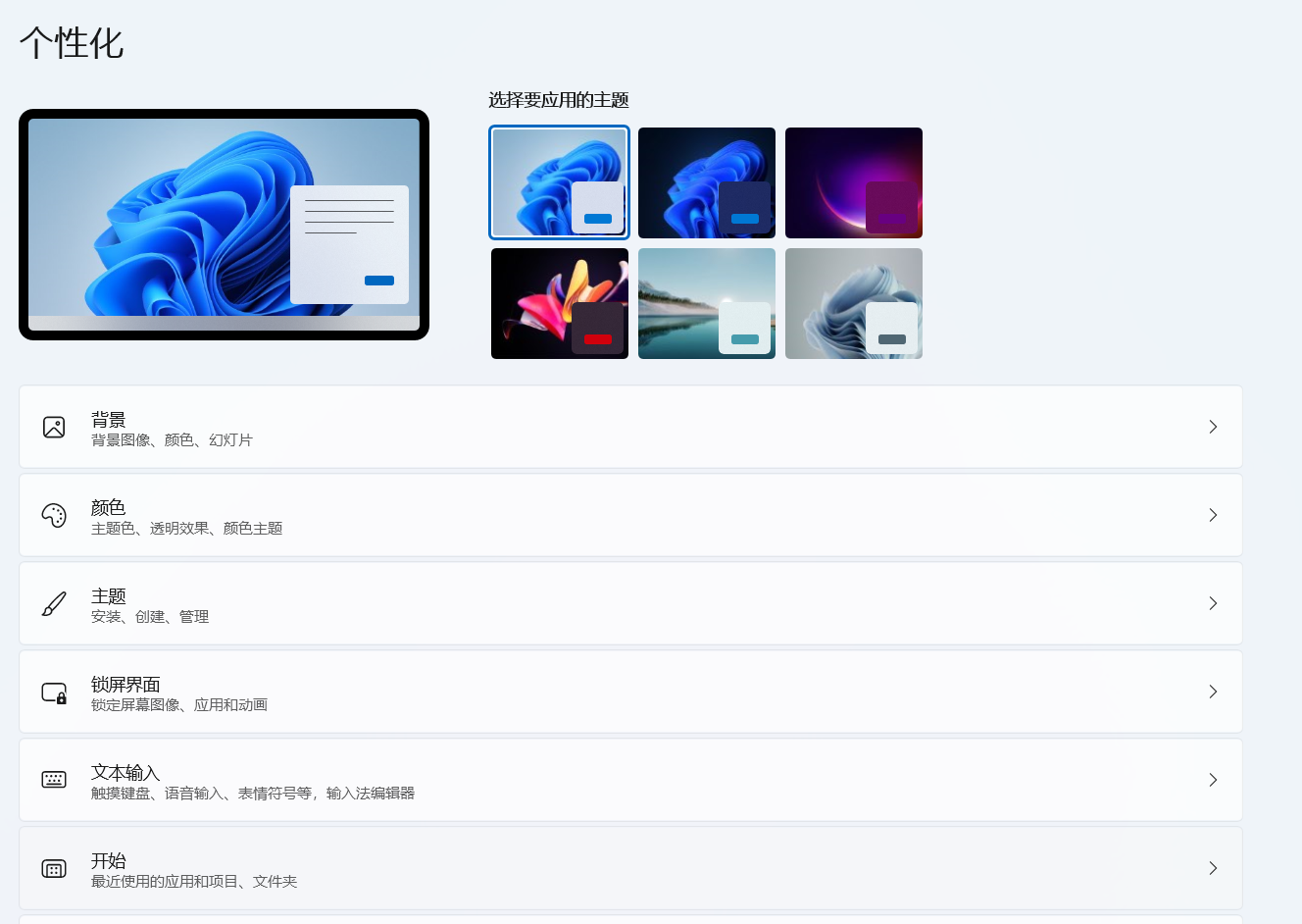 最后,和大家聊一聊这次 Windows 11 的壁纸,更新完成后的默认壁纸依然是这朵标志性的蓝花壁纸,色彩的饱和度和过渡色上,就两个字“高级”!当进入到个性化设置界面,除了默认的蓝花,另外几个主题壁纸也非常典雅。