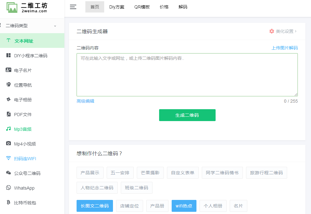 二维工坊在线二维码生成器,零代码小程序一键生成,可制作电子名片、地图导航、wifi网络、PDF文件、电子相册、Mp3音频、录音、小视频等二维码和小程序,还能使用模板美化二维码。