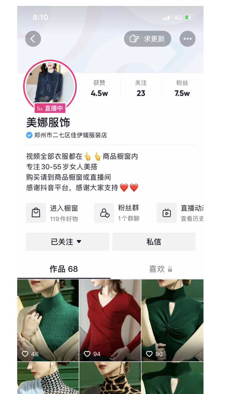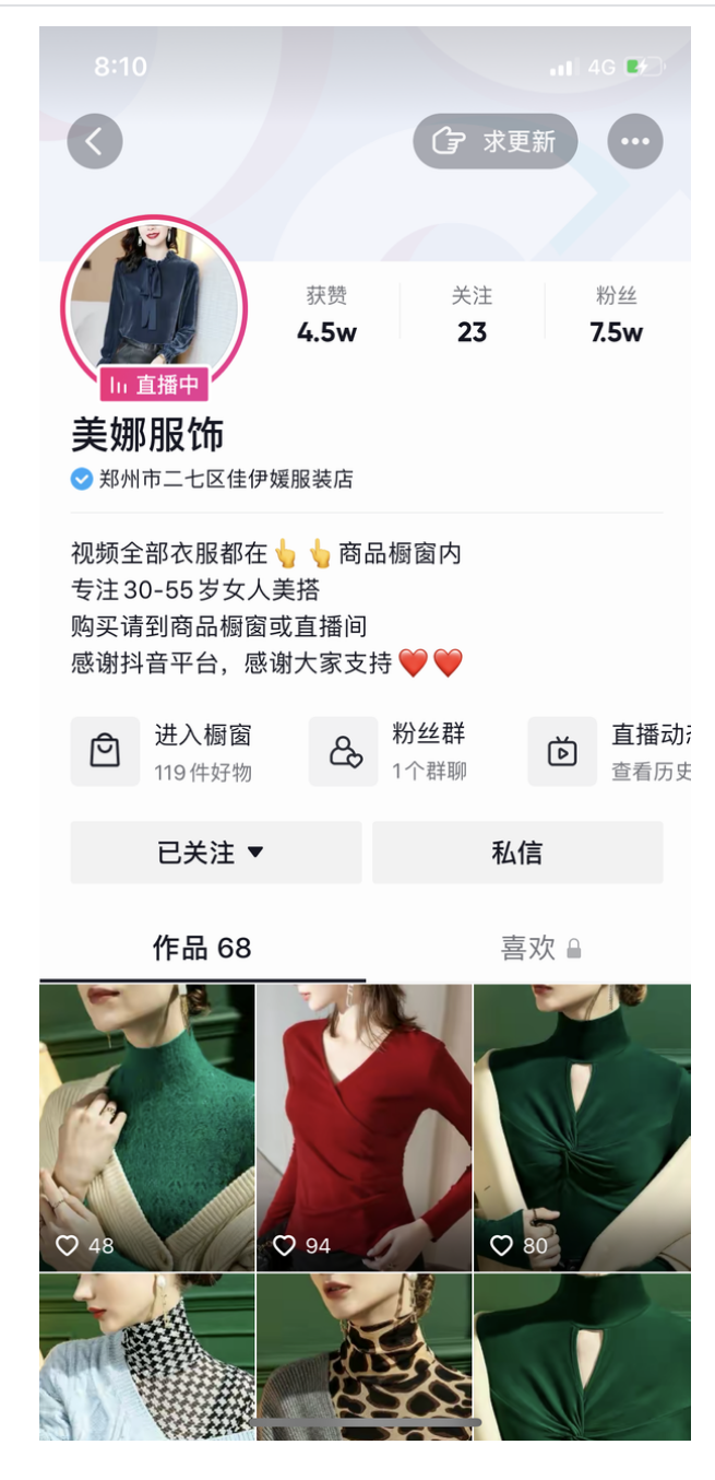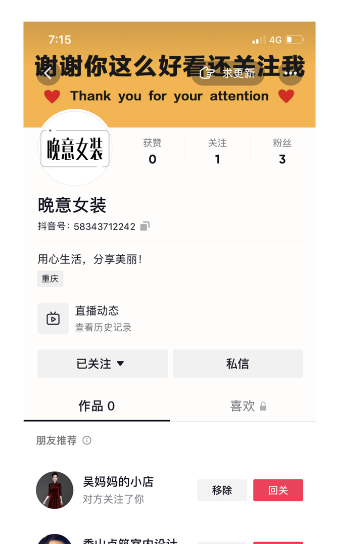我们第一个账号的昵称是晚意女装,是最终版会叫晚意女装(橱窗/直播间购买)